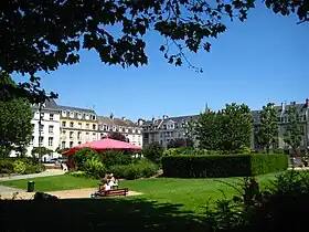 En 1882, Albert Mériel, nouvellement élu à la tête de la municipalité de Caen, décide de rebaptiser le lieu et de déplacer la statue de Louis XIV afin d'effacer le souvenir de toutes « les oppressions et des tyrannies » imputées à la monarchie[20]. Le projet provoque un scandale qui dépasse les limites de la capitale bas-normande ; la presse parisienne s'en fait les échos et même The Times participe à la polémique[21]. La place Royale devient place de la République en [22] et la statue de Louis XIV est déplacée au mois de septembre devant le parc du lycée Malherbe, alors installé dans l'abbaye aux Hommes[23],[N 2]. En 1883, elle est remplacée par un kiosque à musique construit au milieu de la place de la République transformée en square. Cet espace vert est entouré de bordures en granit surmontées d'une grille de 1,20 m de haut. Sous prétexte qu'ils empêchent la lumière de passer et provoquent ainsi l'insalubrité des bâtiments bordant la place, les vieux arbres ceinturant la place sont coupés, à l'exception de ceux qui se trouvaient du côté nord[24]. Plusieurs sculptures sont placées dans le square afin de l'agrémenter :