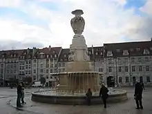 La fontaine de la place est l'une des plus belles fontaines de la ville. Elle date de 1854, elle fut réalisée par Alphonse Delacroix, également sculpteur de la fontaine Bacchus dans le quartier Battant. Elle comportait alors une vasque de 4 mètres de diamètre, brisée en 1860 et jamais remplacée. Très endommagée, la fontaine fut réparée au début du XIXe siècle. Lors des derniers travaux de réaménagement de la place en 2005, elle fut réimplantée à quelques mètres de son ancien emplacement, réhabilitée et modernisée, elle égaye désormais la place par ses jeux d'eau et de lumière[4].