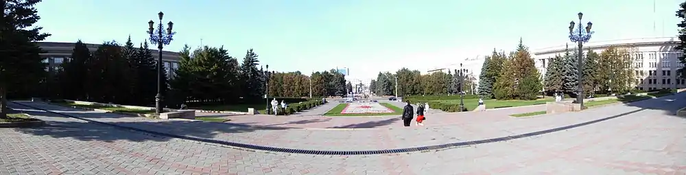 Dans les plans généraux de la ville[3] de 1936 et de 1947, la place prend le rôle de centre administratif de la ville, avec les principales administrations. La partie centrale est prévue pour accueillir les grandes manifestations, les fêtes, les meetings et les parades et défilés et tout autour les grands édifices administratifs. La grande rue Spartacus (aujourd'hui perspective Lénine) était prévue avec des bâtiments néoclassiques; mais cela n'a pas abouti.