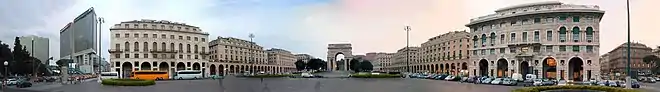 Sur la place se trouve un grand arc de triomphe, l'Arc de la Victoire, réalisé par Edoardo De Albertis, monument aux morts de la Première Guerre mondiale, avec l'escalier du soldat inconnu, appelé « Escalier des trois Caravelles ».