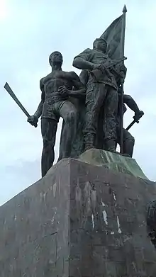 - Trois personnes dont deux hommes et une femme tenant en main des armes et le drapeau du Bénin. Le nu, l’expression marquée des visages et le mouvement des statues des trois personnes réalisées en béton expriment bien le mélange du style antique à celui de la révolution ;
