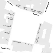 - No 21 : plaque commémorant que « pour la première fois le 24 décembre 1898, une voiture à pétrole pilotée par Louis Renault, son constructeur, atteignit la place du Tertre, marquant ainsi le départ de l’industrie de l’automobile française ».