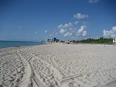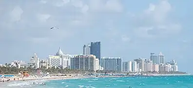 Les plages tropicales d'eau bleu-vert turquoise et de sable blanc de Miami Beach, avec ses célèbres « Lifeguard tower Art déco » de surveillance des plages, sont bordées d'immeubles, hôtels, boutiques, cafés, bars-restaurants, et de boîtes de nuits de style architectural emblématique « Art déco de Miami »[2],[3],[4].