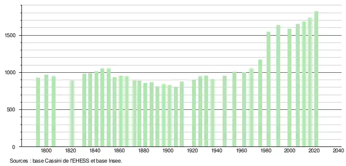 L'évolution du nombre d'habitants est connue à travers les recensements de la population effectués dans la commune depuis 1793. Pour les communes de moins de 10 000 habitants, une enquête de recensement portant sur toute la population est réalisée tous les cinq ans, les populations légales des années intermédiaires étant quant à elles estimées par interpolation ou extrapolation[26]. Pour la commune, le premier recensement exhaustif entrant dans le cadre du nouveau dispositif a été réalisé en 2006[27].