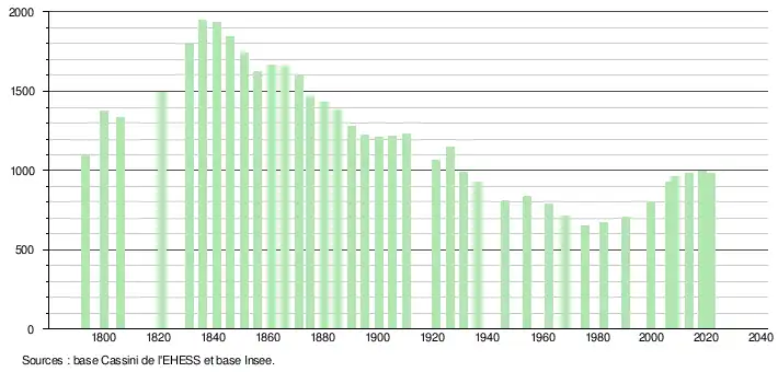 L'évolution du nombre d'habitants est connue à travers les recensements de la population effectués dans la commune depuis 1793. Pour les communes de moins de 10 000 habitants, une enquête de recensement portant sur toute la population est réalisée tous les cinq ans, les populations légales des années intermédiaires étant quant à elles estimées par interpolation ou extrapolation[25]. Pour la commune, le premier recensement exhaustif entrant dans le cadre du nouveau dispositif a été réalisé en 2008[26].