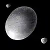 Hauméa possède deux satellites naturels connus, Hiʻiaka (≈310 km) et Namaka (≈170 km), une rotation très rapide de moins de 4 h, et un albédo élevé causé par des cristaux de glace d'eau à sa surface, ce qui en fait un membre exceptionnel parmi les cubewanos[80],[78]. Il est également pensé qu'elle est le composant principal d'une famille collisionnelle d'objets transneptuniens ayant des orbites proches, la famille de Hauméa, qui serait le résultat d'un fort impact responsable de ses caractéristiques inhabituelles[77].