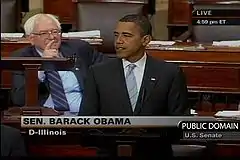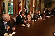 - Les candidats à l'élection présidentielle américaine de 2008, Barack Obama (sénateur démocrate) et John McCain (sénateur républicain), ont voté le en faveur de la loi modifiée et présentée par le Sénat des États-Unis, laquelle sous-tend le Plan Paulson[67],[68],[69]. De plus, Barack Obama a affirmé que « n'importe quel plan de sauvetage doit inclure des façons de recouvrer l'argent, tout en protégeant les familles industrieuses et les grandes institutions financières et doit être conçu pour prévenir de telles crises dans le futur »[trad 15],[70].