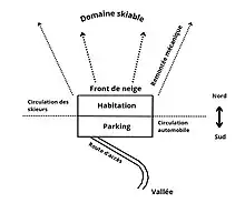 En même temps, une nouvelle façon de bâtir ces stations voit le jour prônant une adaptation à la géographie du lieu [FD 8]. Les habitations de haute altitude doivent répondre à des critères précis, à la fois robustes pour pouvoir lutter face au vent, mais aussi avec un confort permettant d'accueillir des locaux à ski dans l'immeuble. Ces nouvelles stations sont totalement réorganisées sous forme d'un « amphithéâtre » reprenant les codes urbanistiques du « zoning », terme utilisé par les architectes. Au niveau de la scène de celui-ci, un grand parking positionné en flanc de montagne. Dans les premiers rangs, des grands ensembles avec au rez-de-chaussée des boutiques et des cafés ; dans les rangs du fond, le domaine skiable[FD 8]. Cette nouvelle organisation permet aux skieurs de chausser les skis dans leur immeuble au pied des pistes dans une station intégrée. La voiture n'est plus nécessaire, car tous les commerces sont à proximité. Cela permet aussi une vision agréable depuis les immeubles, à la fois sur le flanc de la montagne, mais aussi du côté opposé le front de neige, sur l'arrivée des pistes et le départ des remontées mécaniques[FD 8].