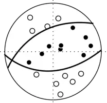 Mécanisme au foyer fictif montrant les deux plans nodaux (en noir). Représentation stéréographique hémisphérique. La faille ayant provoqué le séisme peut être l'un de ces deux plans