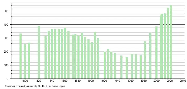 L'évolution du nombre d'habitants est connue à travers les recensements de la population effectués dans la commune depuis 1793. Pour les communes de moins de 10 000 habitants, une enquête de recensement portant sur toute la population est réalisée tous les cinq ans, les populations légales des années intermédiaires étant quant à elles estimées par interpolation ou extrapolation[29]. Pour la commune, le premier recensement exhaustif entrant dans le cadre du nouveau dispositif a été réalisé en 2007[30].