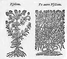 Le pharmacologue grec Dioscoride[4] (Ier siècle) consacre la section IV, 69, de sa Materia medica au psyllion ψυλλιον « herbe aux puces ». Il indique « Ses feuilles sont semblables à celles du plantain corne de cerf, il est rêche, il a des ramifications d'un empan. C'est une petite plante herbacée. Ses feuilles commencent au milieu de la tige. En haut, il y a deux à trois petites têtes compactes qui contiennent les graines semblables à des puces, noires et dures ». L'indication d'une tige feuillée (plutôt que des feuilles en rosette, comme pour P. ovata) et de la couleur noire des graines, incline à interpréter le psyllion comme le Plantago afra, L. 1762[n 2].