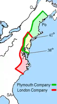 Territoire octroyé par le roi Jacques VI et Ier aux compagnies anglaises en 1606. Autres colonies Q : Québec R : Port Royal (France) ; SA : Saint Augustine (Espagne) ; Po : Popham J : Jamestown (Angleterre).