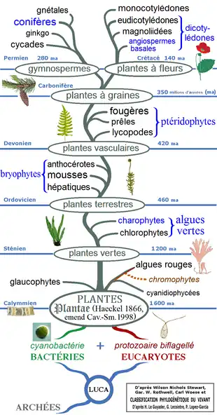 L'image ci-contre représente un arbre phylogénétique des plantes vivantes, montrant les éléments suivants :