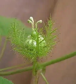 De même, les bractées modifiées et collantes de la Passiflora foetida ont été étudiées pour leurs aptitudes à la carnivorité. Un article publié en 1995 dans le Journal of Biosciences a détaillé la preuve que les bractées glandulaires jouaient un rôle dans la défense de la fleur et étaient également capables de digérer les proies capturées pour en absorber les nutriments[16].
