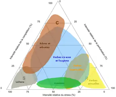 Triangle de Grime avec les trois stratégies végétales principales sélectionnées en réponse à différents facteurs environnementaux (biotiques ou abiotiques) : stratégie compétitive (C), tolérance au stress (S) et rudéralisation (R).