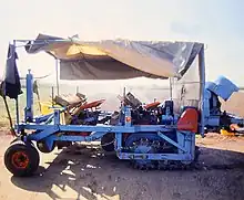 Repiquage d'œilletons d'artichauts avec un tracteur à roues étroites et une planteuse à quatre rangs équipée de traceurs. La mise en œuvre de la machine nécessite cinq personnes sans compter la préparation des œilletons, Bretagne, 2006. - des roulettes de tassement assurant la fermeture du sillon ; elle peuvent être complétées par des rasettes, l'ensemble permettant alors un buttage sommaire.