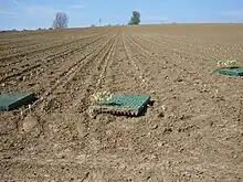 Repiquage d'œilletons d'artichauts avec un tracteur à roues étroites et une planteuse à quatre rangs équipée de traceurs. La mise en œuvre de la machine nécessite cinq personnes sans compter la préparation des œilletons, Bretagne, 2006. - des roulettes de tassement assurant la fermeture du sillon ; elle peuvent être complétées par des rasettes, l'ensemble permettant alors un buttage sommaire.