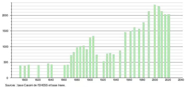 L'évolution du nombre d'habitants est connue à travers les recensements de la population effectués dans la commune depuis 1793. Pour les communes de moins de 10 000 habitants, une enquête de recensement portant sur toute la population est réalisée tous les cinq ans, les populations légales des années intermédiaires étant quant à elles estimées par interpolation ou extrapolation[26]. Pour la commune, le premier recensement exhaustif entrant dans le cadre du nouveau dispositif a été réalisé en 2005[27].