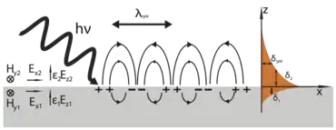Le plasmon de surface est une onde électromagnétique guidée à la surface d’un métal. Elle se propage partiellement dans le métal (l’onde y pénètre à une profondeur de 25 nm typiquement pour les métaux nobles). Le plasmon de surface étant un mode guidé, se propageant le long d’une interface plane, il ne peut pas être excité simplement par un faisceau de lumière incident. Il faut utiliser un coupleur (à prisme ou à réseau). Une des caractéristiques les plus importantes du plasmon de surface est que c’est un mode localisé à l’interface. Dit autrement, on arrive à obtenir un champ particulièrement intense au niveau de la surface du métal[1].