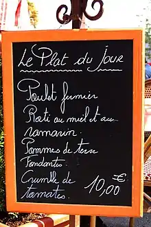 Le plat du jour est un mets proposé par un traiteur ou dans un restaurant, en dehors de la carte, et qui change chaque jour.