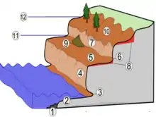 1) falaise sous-marine, 2) platier actuel, 3) encoche littorale, 4) falaise actuelle, 5) paléoplatier I, 6) angle du paléorivage, 7) paléofalaise I, 8) colluvion, 9) cône de déjection, 10) platier II, 11) paléorivage I, 12) paléorivage II.