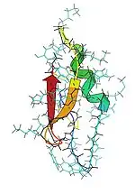 La plectasine est un antibiotique peptidique constitué de 40 résidus d'acides aminés. Elle a été décrite chez Pseudoplectania nigrella (en), un mycète de l'ordre des Pezizales qui lui a donné son nom. Sa structure l'apparente à la famille des défensines, peptides courts — quelques dizaines de résidus d'acides aminés tout au plus — qui se fixent sur la paroi des bactéries et provoquent leur lyse, qu'on trouve chez d'autres espèces de champignons ainsi que chez des invertébrés tels que les araignées, les scorpions, les libellules et les bivalves[2].