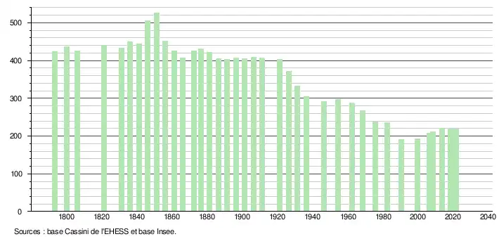 L'évolution du nombre d'habitants est connue à travers les recensements de la population effectués dans la commune depuis 1793. Pour les communes de moins de 10 000 habitants, une enquête de recensement portant sur toute la population est réalisée tous les cinq ans, les populations légales des années intermédiaires étant quant à elles estimées par interpolation ou extrapolation[21]. Pour la commune, le premier recensement exhaustif entrant dans le cadre du nouveau dispositif a été réalisé en 2008[22].
