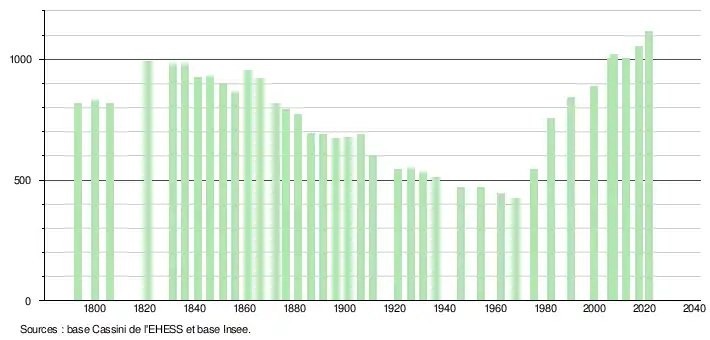 L'évolution du nombre d'habitants est connue à travers les recensements de la population effectués dans la commune depuis 1793. Pour les communes de moins de 10 000 habitants, une enquête de recensement portant sur toute la population est réalisée tous les cinq ans, les populations légales des années intermédiaires étant quant à elles estimées par interpolation ou extrapolation[22]. Pour la commune, le premier recensement exhaustif entrant dans le cadre du nouveau dispositif a été réalisé en 2007[23].