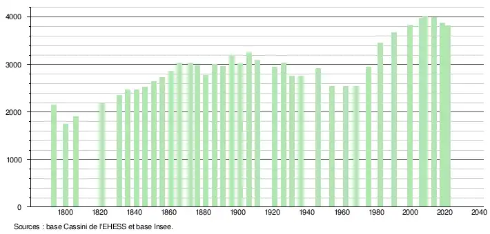 - Population municipale légale en vigueur au 1er janvier 2024, millésimée 2021, définie dans les limites territoriales en vigueur au 1er janvier 2023, date de référence statistique : 1er janvier 2021.