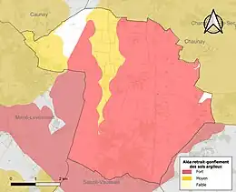 Les mouvements de terrains susceptibles de se produire sur la commune sont des tassements différentiels[16]. Le retrait-gonflement des sols argileux est susceptible d'engendrer des dommages importants aux bâtiments en cas d’alternance de périodes de sécheresse et de pluie[17]. 95,5 % de la superficie communale est en aléa moyen ou fort (54,9 % au niveau départemental et 48,5 % au niveau national)[Carte 2]. Depuis le , en application de la loi ELAN, différentes contraintes s'imposent aux vendeurs, maîtres d'ouvrages ou constructeurs de biens situés dans une zone classée en aléa moyen ou fort[Note 2],[18].