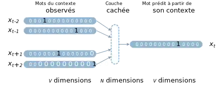 Dans les deux cas, on définit un réseau de neurones artificiels qui a une couche d'entrée , et une couche de sortie . Ces vecteurs sont binaires et de taille . Une couche cachée à dimensions est intercalée entre les deux. est un hyperparamètre d'apprentissage. L'entraînement du réseau produit une matrice de taille , connectée à gauche aux entrées et à droite à la couche cachée. Au terme de l'apprentissage, la matrice contient les plongements de tous les mots du vocabulaire.