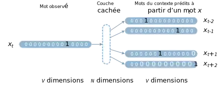 Le modèle skip-gram[9] apprend en considérant un mot tiré d'une phrase donnée. Autrement dit pour entraîner le réseau de neurones nous considérons une phrase , on en extrait un mot qui sera notre entrée du réseau . Le reste de la phrase sera notre sortie .