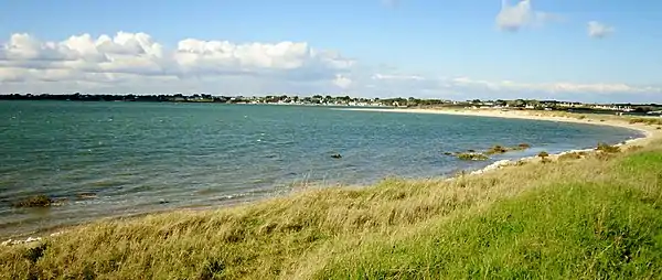 La plage de Pen er Lé ; à l'arrière-plan le bourg de Plouharnel.