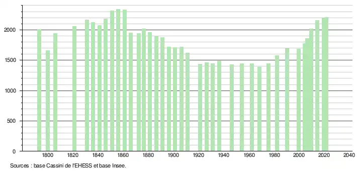 L'évolution du nombre d'habitants est connue à travers les recensements de la population effectués dans la commune depuis 1793. Pour les communes de moins de 10 000 habitants, une enquête de recensement portant sur toute la population est réalisée tous les cinq ans, les populations légales des années intermédiaires étant quant à elles estimées par interpolation ou extrapolation[23]. Pour la commune, le premier recensement exhaustif entrant dans le cadre du nouveau dispositif a été réalisé en 2004[24].