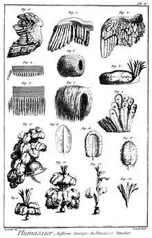 Aux termes de leurs statuts, les plumassiers avaient le droit de confectionner « toutes sortes d'habillements de tête », panaches, chapeaux et bonnets de mascarades, bouquets pour églises, toques, aigrettes, guirlandes pour carrousels, ballets et courses de bagues ; ils pouvaient teindre toutes espèces de plumes en toutes couleurs, les enrichir et enjoliver d'or et d'argent vrai ou faux. Ils employaient surtout les plumes d'autruche, de héron, de coq, d'oie, de vautour, de paon et de geai[4].