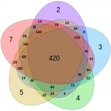 Pour le nombre premier 2, le plus grand exposant est 3. Pour les nombres premiers 3, 5 et 7, le plus grand exposant est 1. On a ainsi PPCM(60, 168) = 23×3×5×7 = 840.