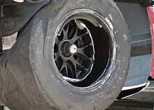 - Slick : les pneus slick (lisses) sont utilisés en compétition, par exemple automobile ou motocycliste, par temps sec. Ils sont aussi appréciés des cyclistes. La bande de roulement est sans rainure ce qui permet de maximiser la surface en contact avec le sol et de minimiser les déformations de la bande de roulement[alpha 5] et donc d'améliorer la résistance au roulement. L'utilisation de gommes tendres permet d'améliorer l'adhérence (mais leur usure est d'autant plus rapide). Par contre, sur sol humide, l'adhérence est fortement altérée par le phénomène d'aquaplanage, une pellicule d'eau se formant entre la route et le pneumatique. Dans de telles conditions, les pilotes utilisent des pneus pluie[14]. En dehors des vélos, les slicks sont interdits sur la voie publique.