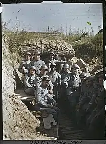 Poilus dans les tranchées, avec au premier plan un mortier de tranchée.