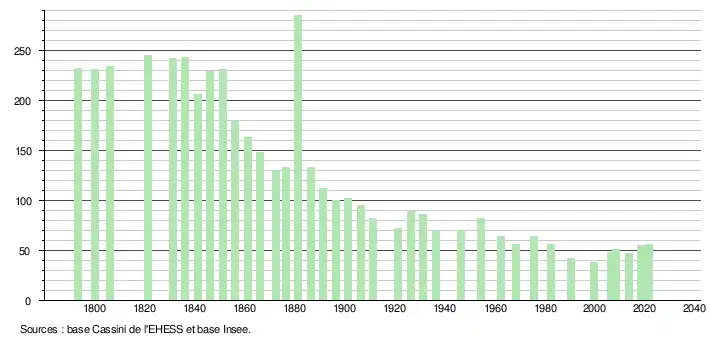 L'évolution du nombre d'habitants est connue à travers les recensements de la population effectués dans la commune depuis 1793. Pour les communes de moins de 10 000 habitants, une enquête de recensement portant sur toute la population est réalisée tous les cinq ans, les populations légales des années intermédiaires étant quant à elles estimées par interpolation ou extrapolation[14]. Pour la commune, le premier recensement exhaustif entrant dans le cadre du nouveau dispositif a été réalisé en 2008[15].