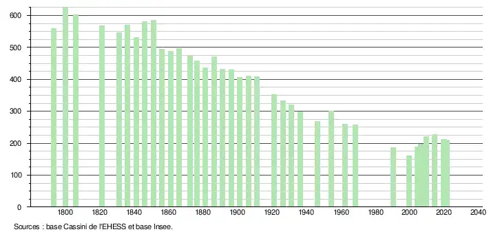 L'évolution du nombre d'habitants est connue à travers les recensements de la population effectués dans la commune depuis 1793. Pour les communes de moins de 10 000 habitants, une enquête de recensement portant sur toute la population est réalisée tous les cinq ans, les populations légales des années intermédiaires étant quant à elles estimées par interpolation ou extrapolation[14]. Pour la commune, le premier recensement exhaustif entrant dans le cadre du nouveau dispositif a été réalisé en 2004[15].