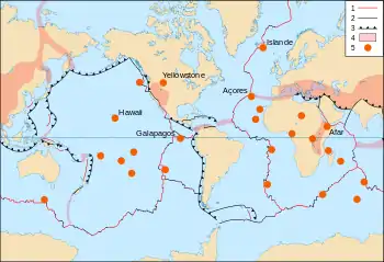| Islande | 14 | Eurasiatique Nord-américaine | 64° 24′ N, 17° 18′ O | p = 0,8 ; az = 75 ± 10° ; v = 5 ± 3 mm/an p = 0,8 ; az = 287 ± 10° ; v = 15 ± 5 mm/an | A donné naissance à l'Islande. Peut-être apparu avec la dorsale médio-atlantique il y a 62 Ma[12]. |