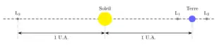 - L3 : sur la ligne définie par les deux masses, au-delà de la plus grande. Dans le cas où l'un des deux corps est notablement moins massif que l'autre, la distance entre L3 et le corps massif est comparable avec celle entre les deux corps ;