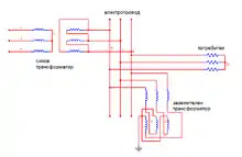 - Un transformateur des auxiliaires adapté, soit avec un enroulement primaire en zigzag Znyn, soit avec un enroulement supplémentaire en triangle avec résistance extérieure insérée dans le triangle (Ynyn(d))