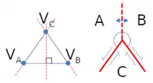 Par conséquent, par rapport au triangle , le point représentatif de la vitesse devra se situer sur une droite passant par , et de même direction que la frontière (AB), quelle qu'elle soit. Noter que dans ce cas, la position de A et B est inversée entre le schéma géologique et le schéma des vitesses.