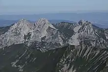 Vue aérienne de la partie centrale de la chaîne du Bargy depuis le sud-est avec de gauche à droite le pic de Jallouvre, la pointe Blanche et la pointe du Midi.