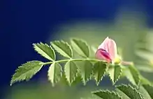 Les feuilles, composées imparipennées (avec une foliole terminale), présentent 3 à 8 paires de folioles. Celles-ci peuvent atteindre 17 mm de long sur 10 mm de large, avec des bords dentés et des poils glandulaires faibles et étalés. À la base des feuilles, se trouvent des stipules triangulaires[6].