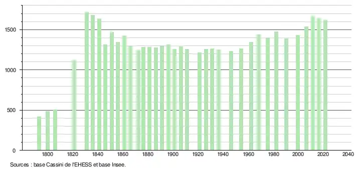 L'évolution du nombre d'habitants est connue à travers les recensements de la population effectués dans la commune depuis 1793. Pour les communes de moins de 10 000 habitants, une enquête de recensement portant sur toute la population est réalisée tous les cinq ans, les populations légales des années intermédiaires étant quant à elles estimées par interpolation ou extrapolation[30]. Pour la commune, le premier recensement exhaustif entrant dans le cadre du nouveau dispositif a été réalisé en 2006[31].
