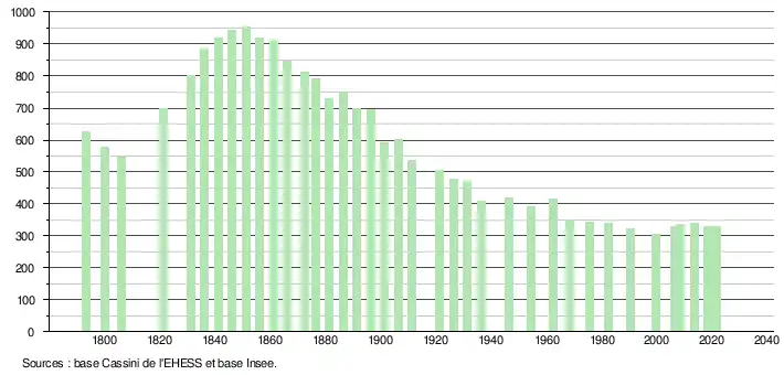L'évolution du nombre d'habitants est connue à travers les recensements de la population effectués dans la commune depuis 1793. Pour les communes de moins de 10 000 habitants, une enquête de recensement portant sur toute la population est réalisée tous les cinq ans, les populations légales des années intermédiaires étant quant à elles estimées par interpolation ou extrapolation[22]. Pour la commune, le premier recensement exhaustif entrant dans le cadre du nouveau dispositif a été réalisé en 2008[23].