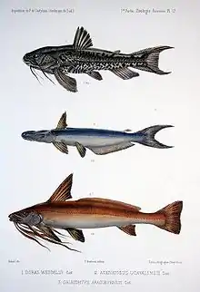 - (en) J.P. Sullivan, J.G. Lundberg et M. Hardman, « A phylogenetic analysis of the major groups of catfishes (Teleostei: Siluriformes) using rag1 and rag2 nuclear gene sequences », Mol Phylogenet Evol., vol. 41, no 3, , p. 636–62 (PMID 16876440, DOI 10.1016/j.ympev.2006.05.044)