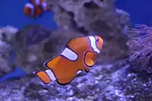 Leur couleur, globalement dans les tons d'orange, varie du jaune-orangé à l'orange sombre voire au rose. Certaines espèces ont de zéro à trois bandes verticales blanches ou une bande dorsale. La couleur blanche des bandes est due à des cellules particulières qui réfléchissent la lumière, des iridophores[3]. On observe des variations géographiques de la couleur pour les espèces à large aire de répartition. D'autres facteurs interviennent également sur la coloration des poissons-clowns comme le mélanisme[4] et la taille des individus. Le mélanisme est induit par l'anémone de mer hôte. Il intervient en quelques heures après la mise en contact des partenaires. La plus-value adaptative de ce changement est inconnue[5].